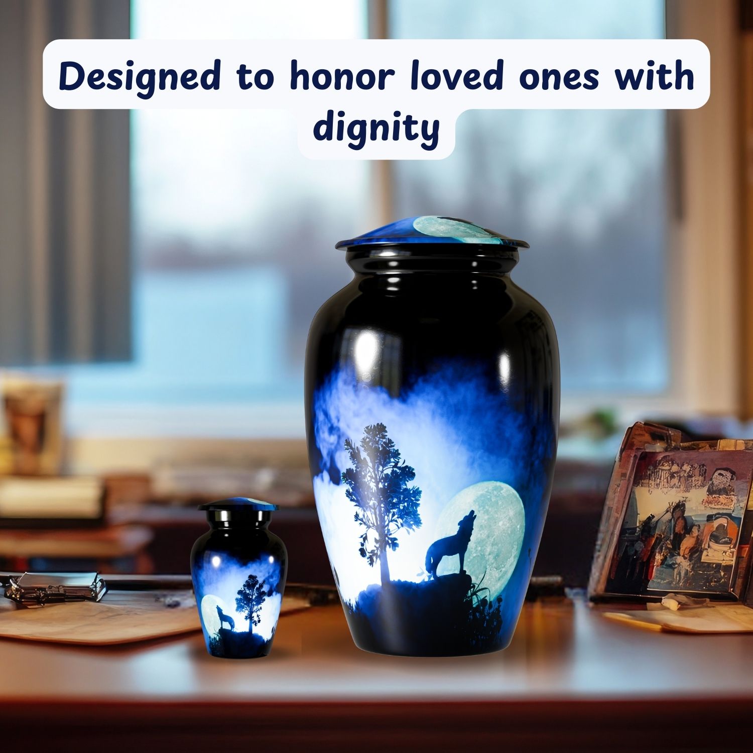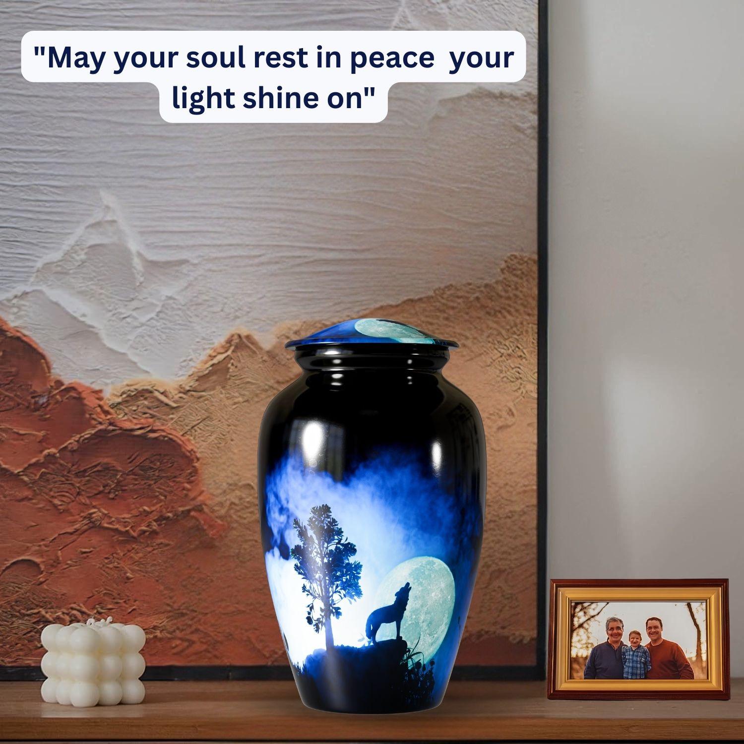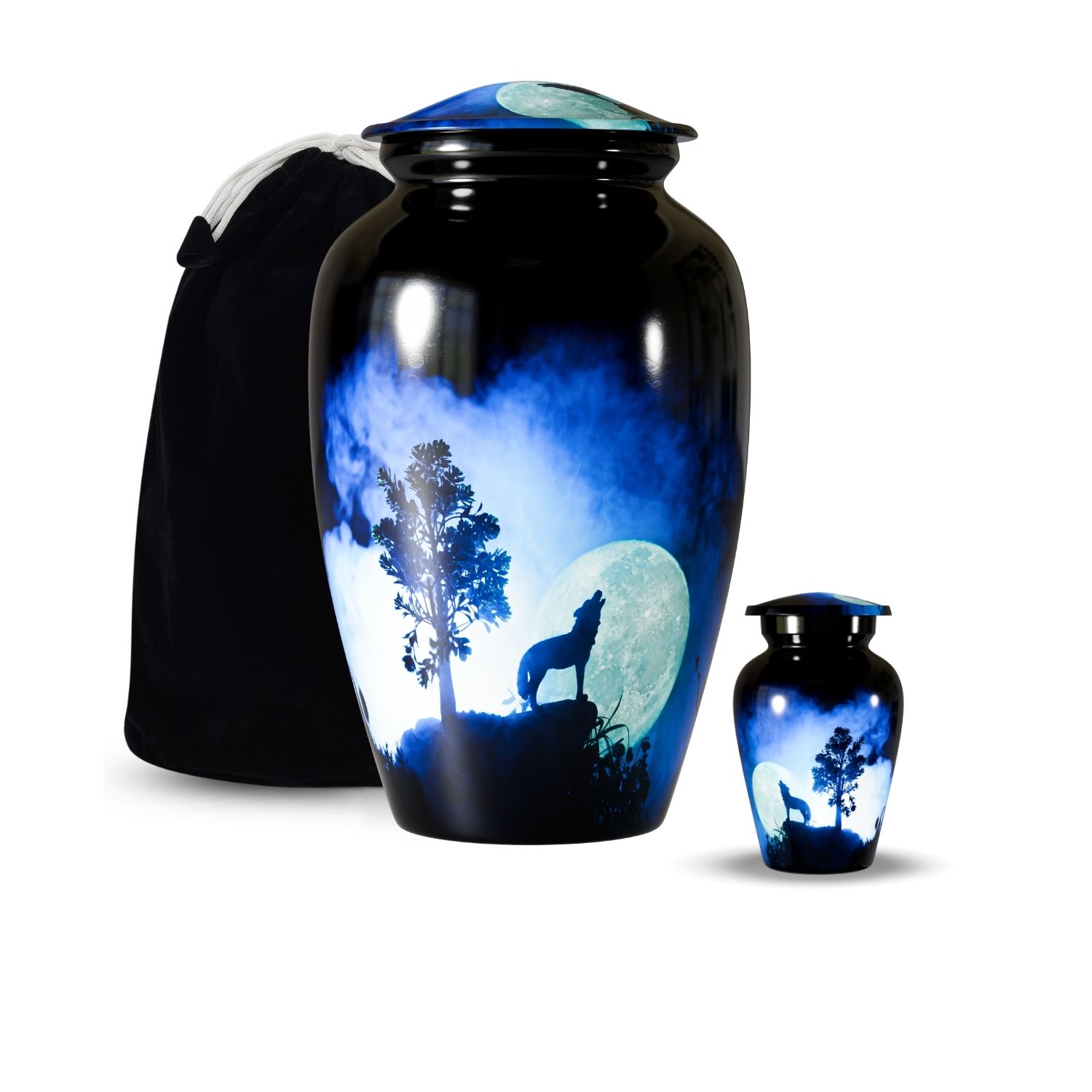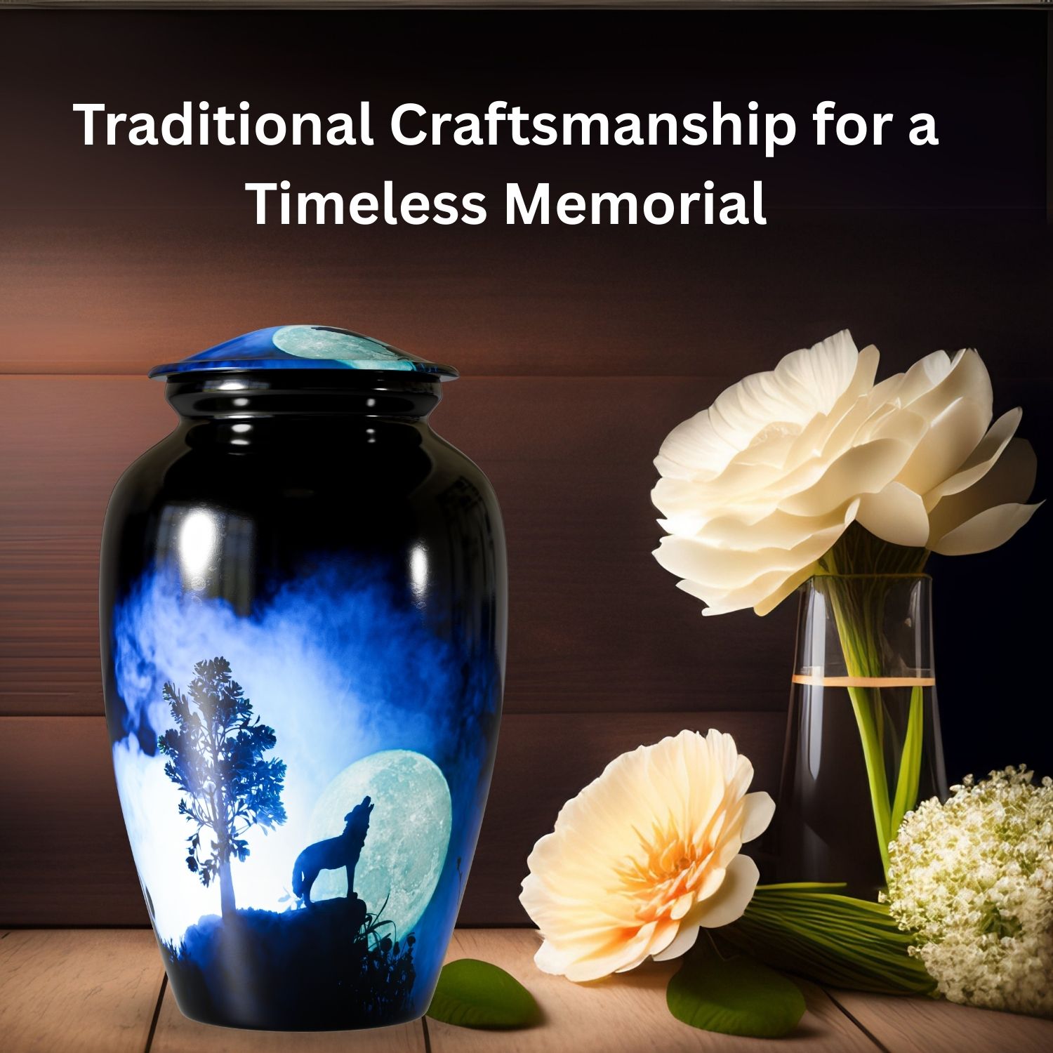 The Howling Wolf Cremation Urn for Human Ashes captures the spirit of resilience, loyalty, and freedom. Featuring a striking silhouette of a wolf howling beneath a glowing moon, this design represents guidance, remembrance, and a soul that continues its journey beyond life.