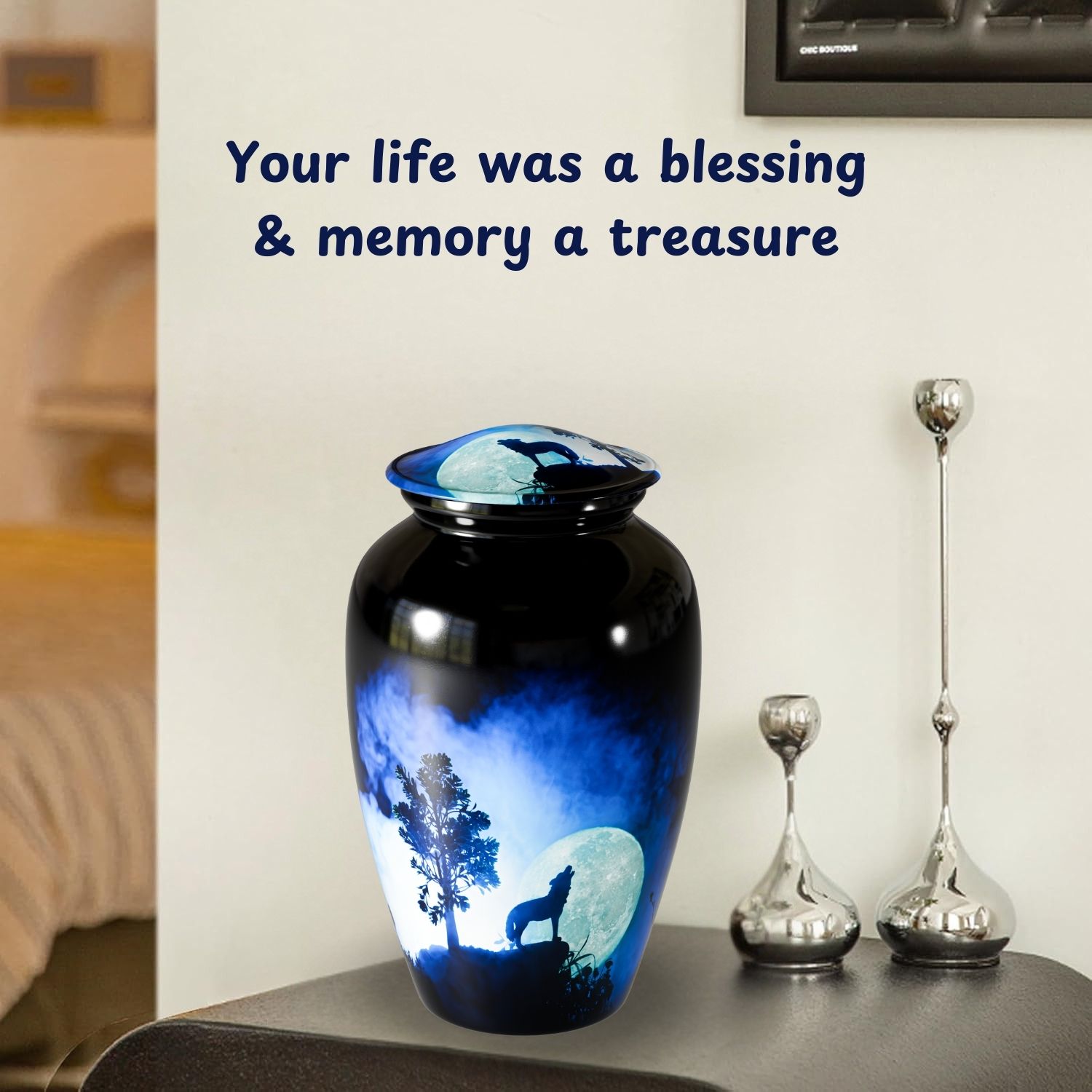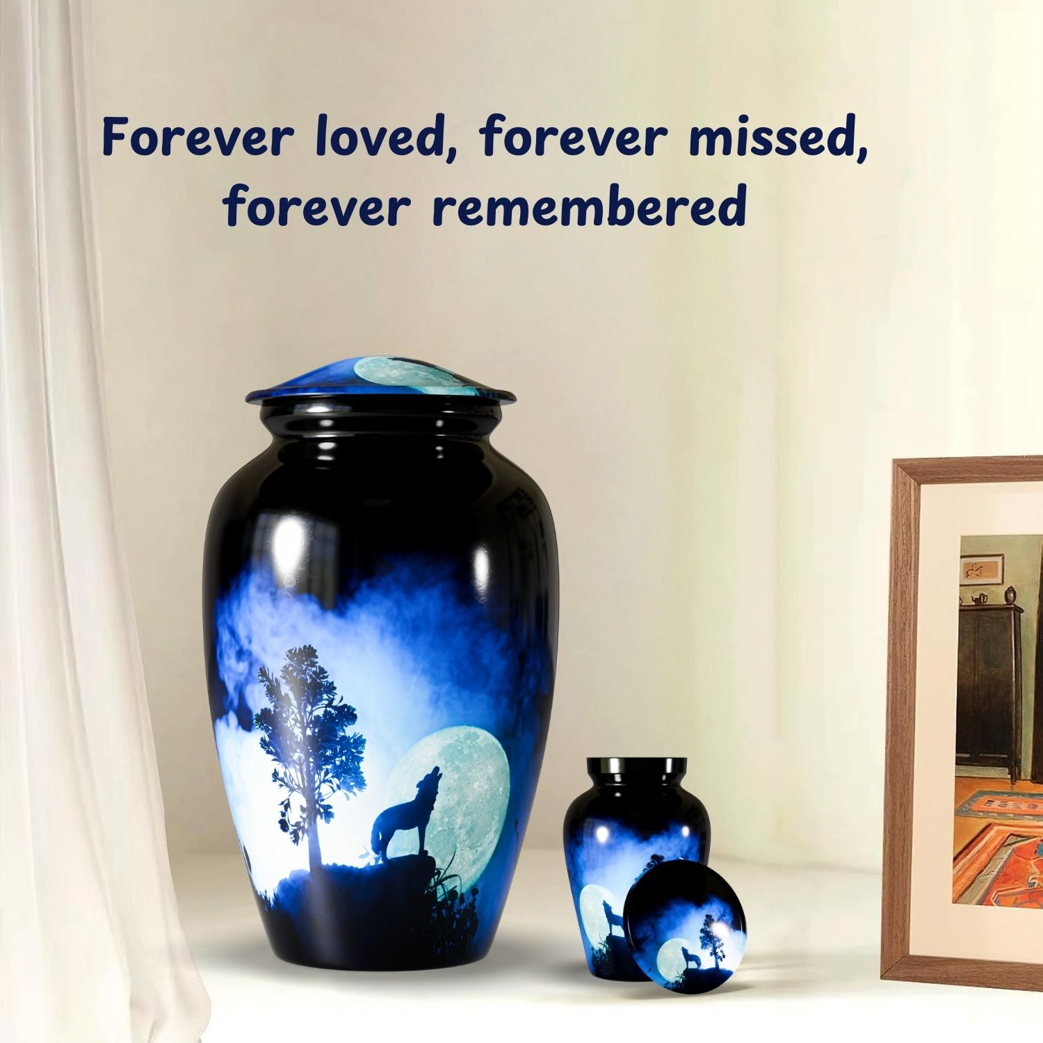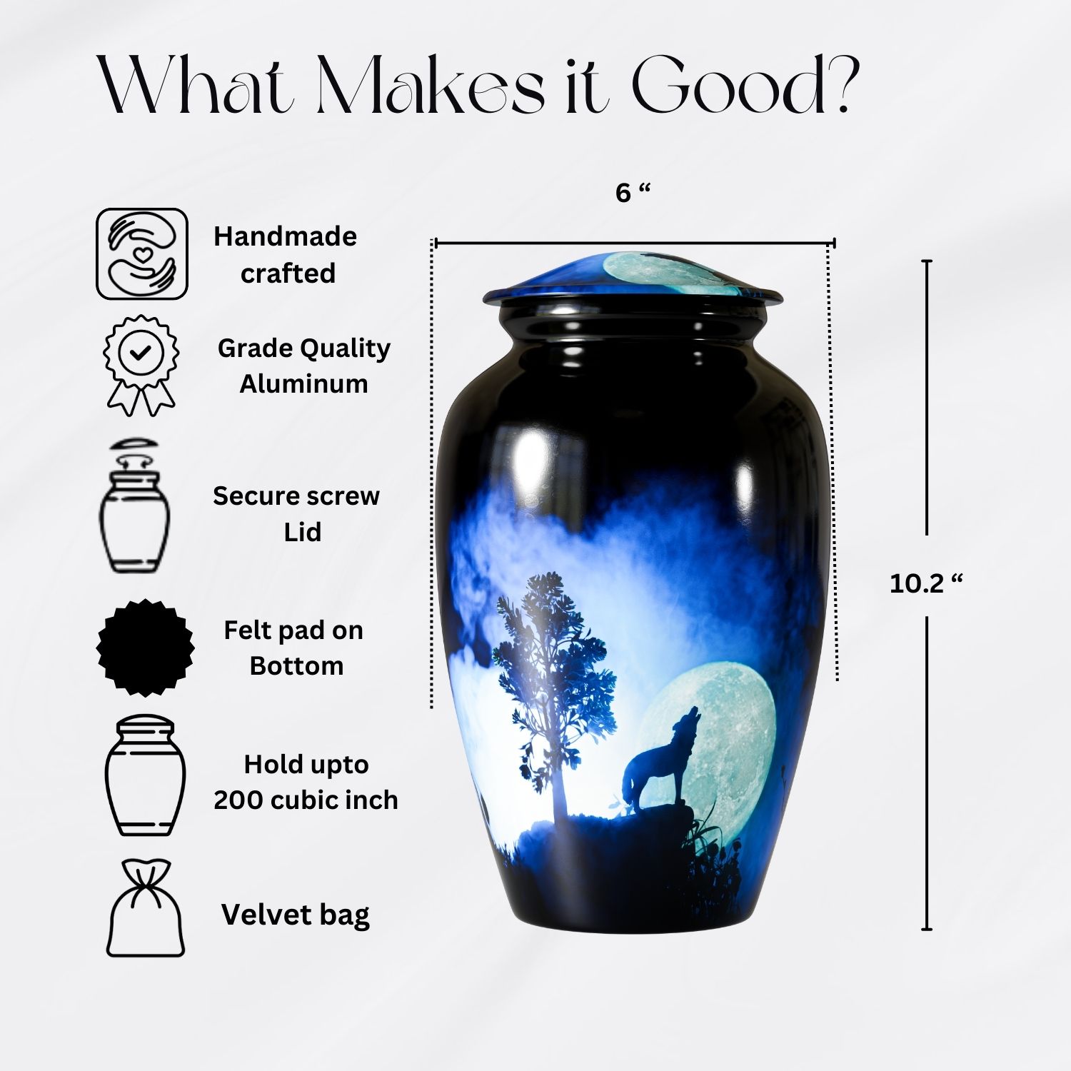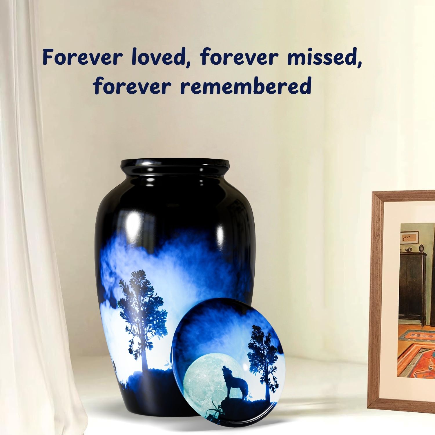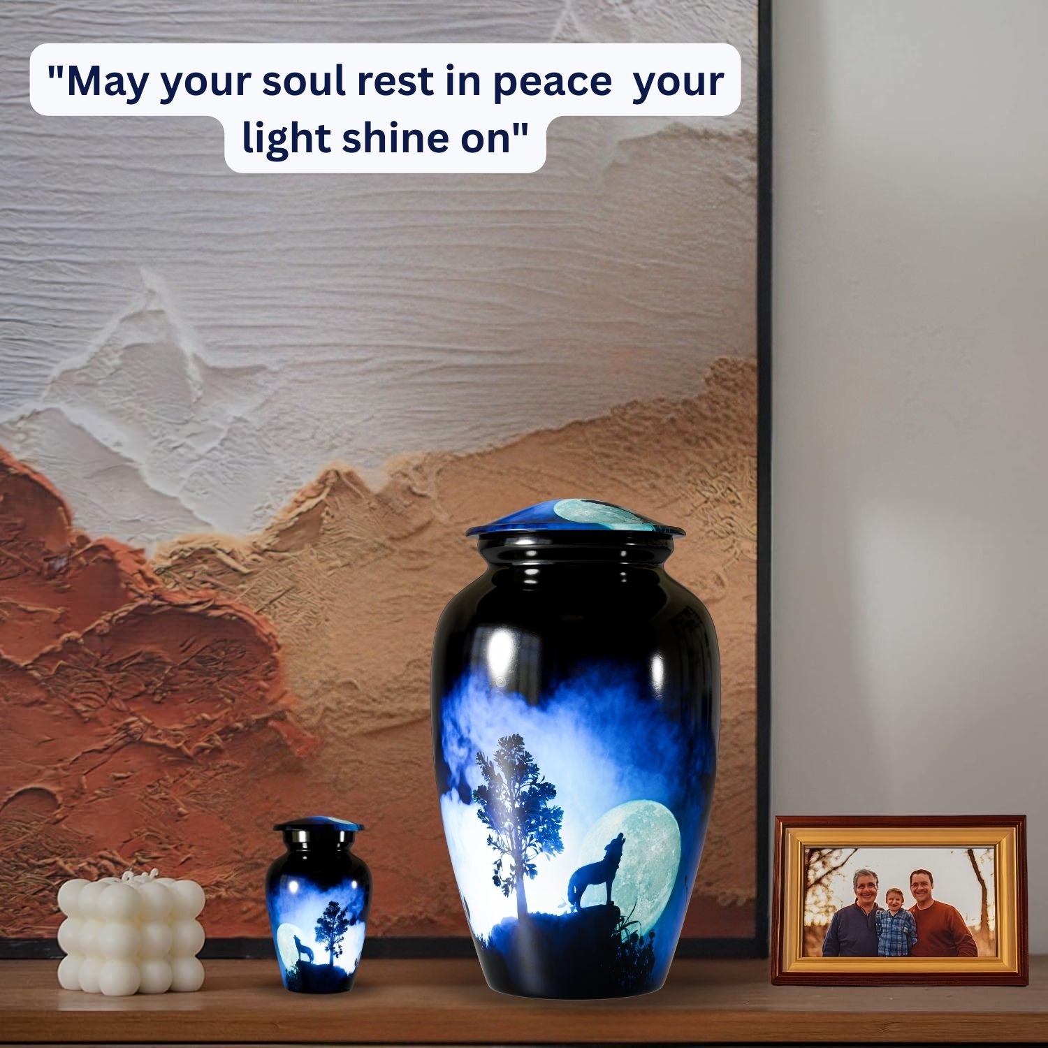 The Howling Wolf Cremation Urn for Human Ashes captures the spirit of resilience, loyalty, and freedom. Featuring a striking silhouette of a wolf howling beneath a glowing moon, this design represents guidance, remembrance, and a soul that continues its journey beyond life.