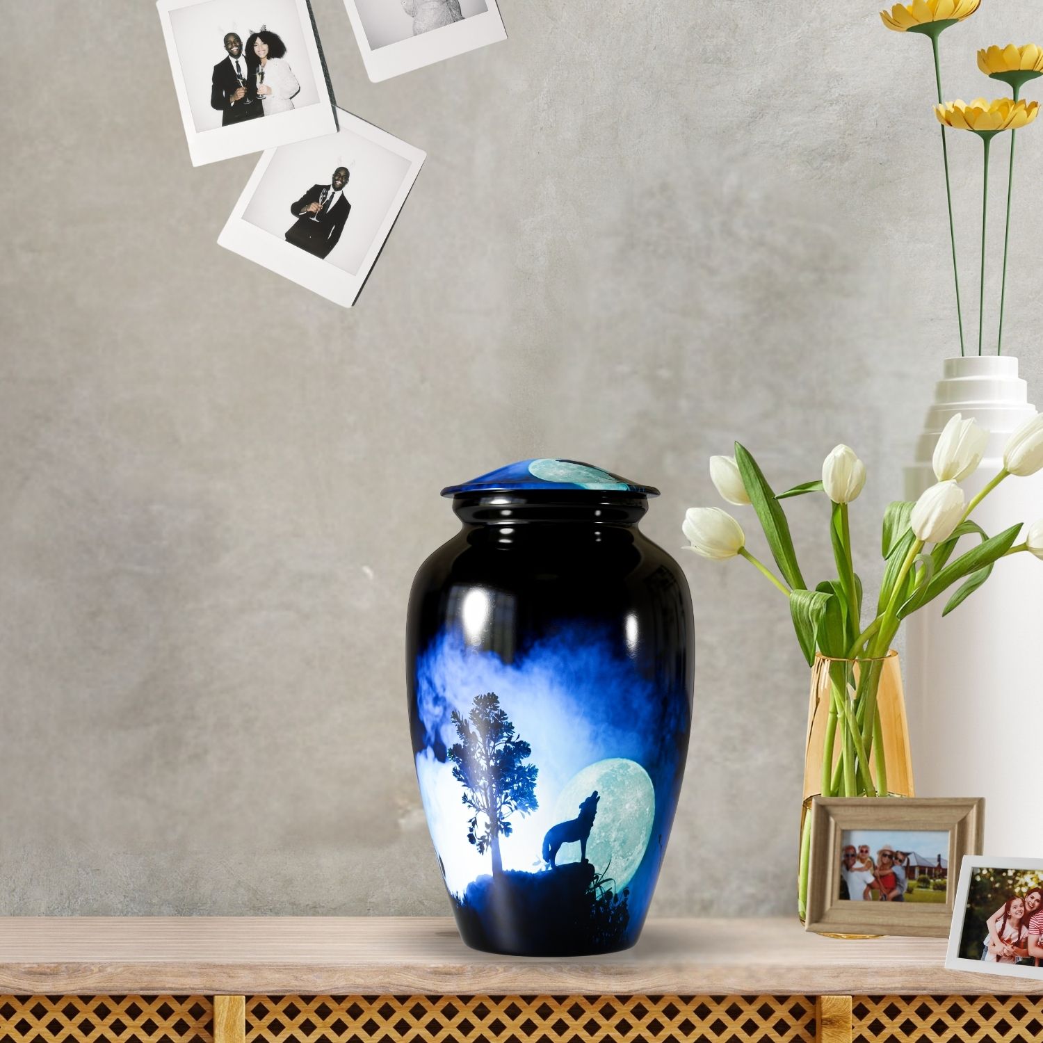 Ideal for those searching for cremation urns, urns for human ashes, or funeral urns for adults, this handcrafted wolf urn blends emotional depth with lasting quality, making it a timeless memorial for home or remembrance spaces.
