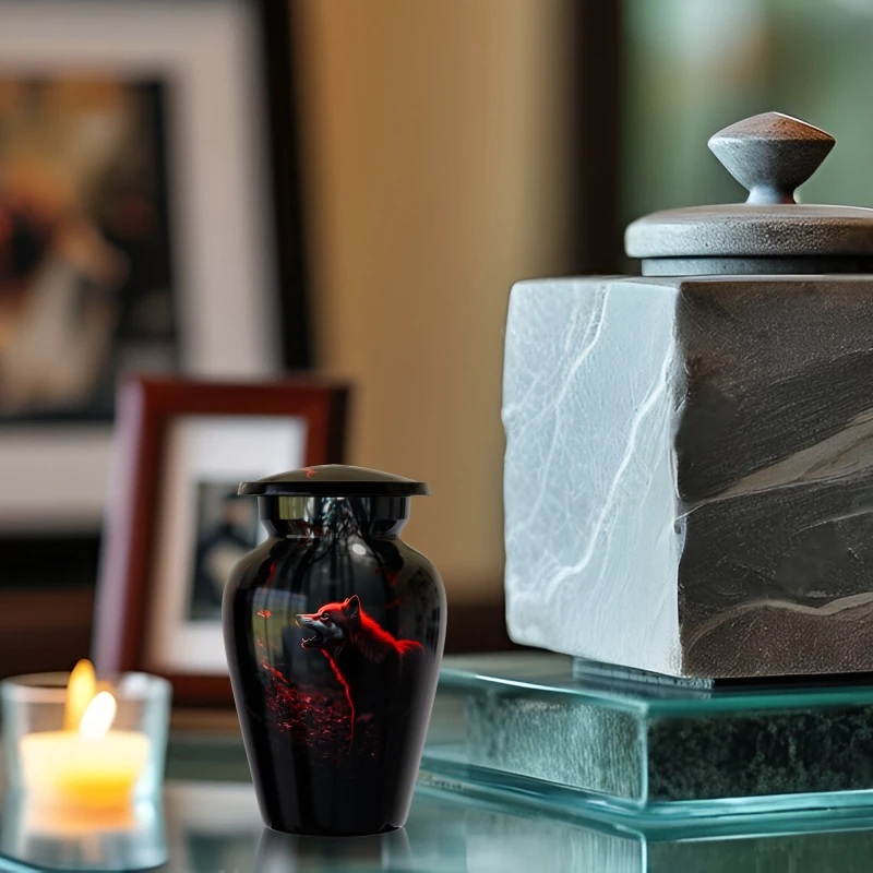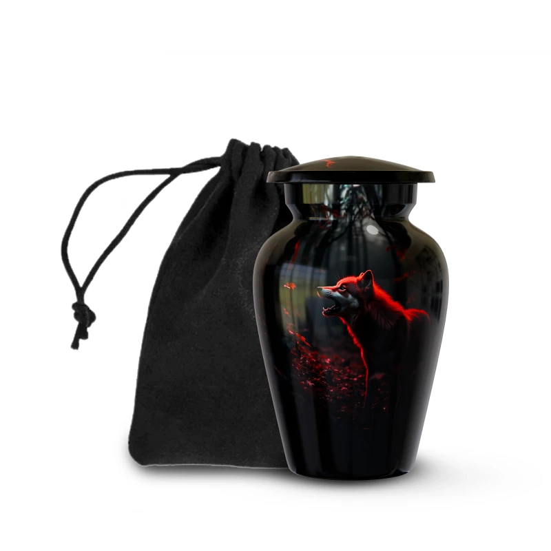 Small keepsake wolf urn crafted from premium aluminum with a secure threaded lid, ideal for sharing a small portion of ashes or keeping a personal memorial at home.